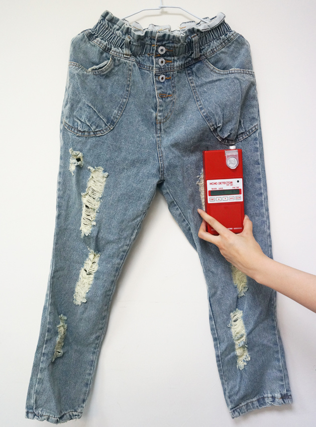 使用甲醛檢測器測量出新牛仔褲逸散在空氣中的甲醛濃度高達 0.16ppm