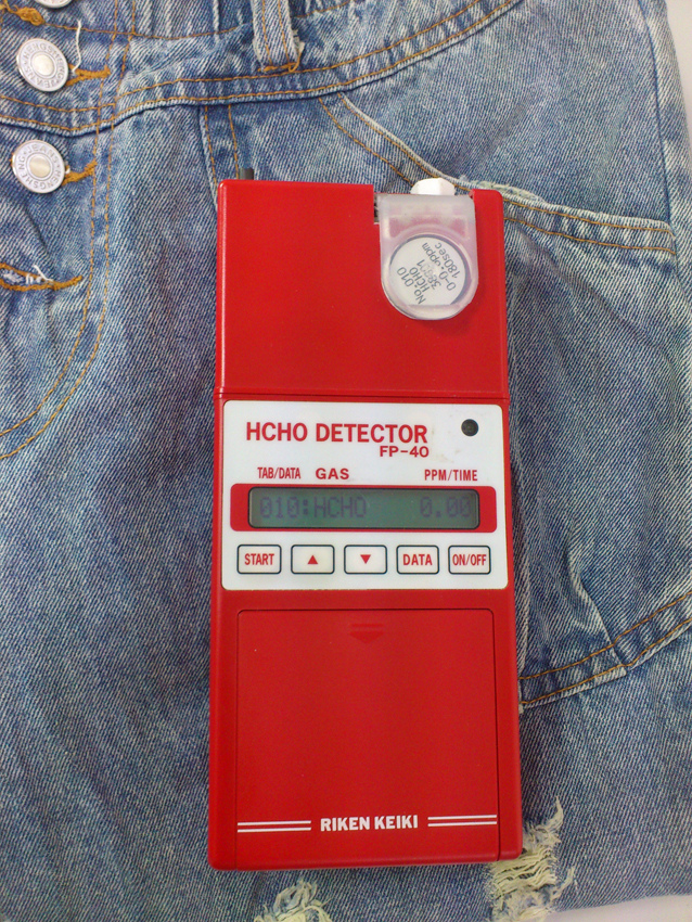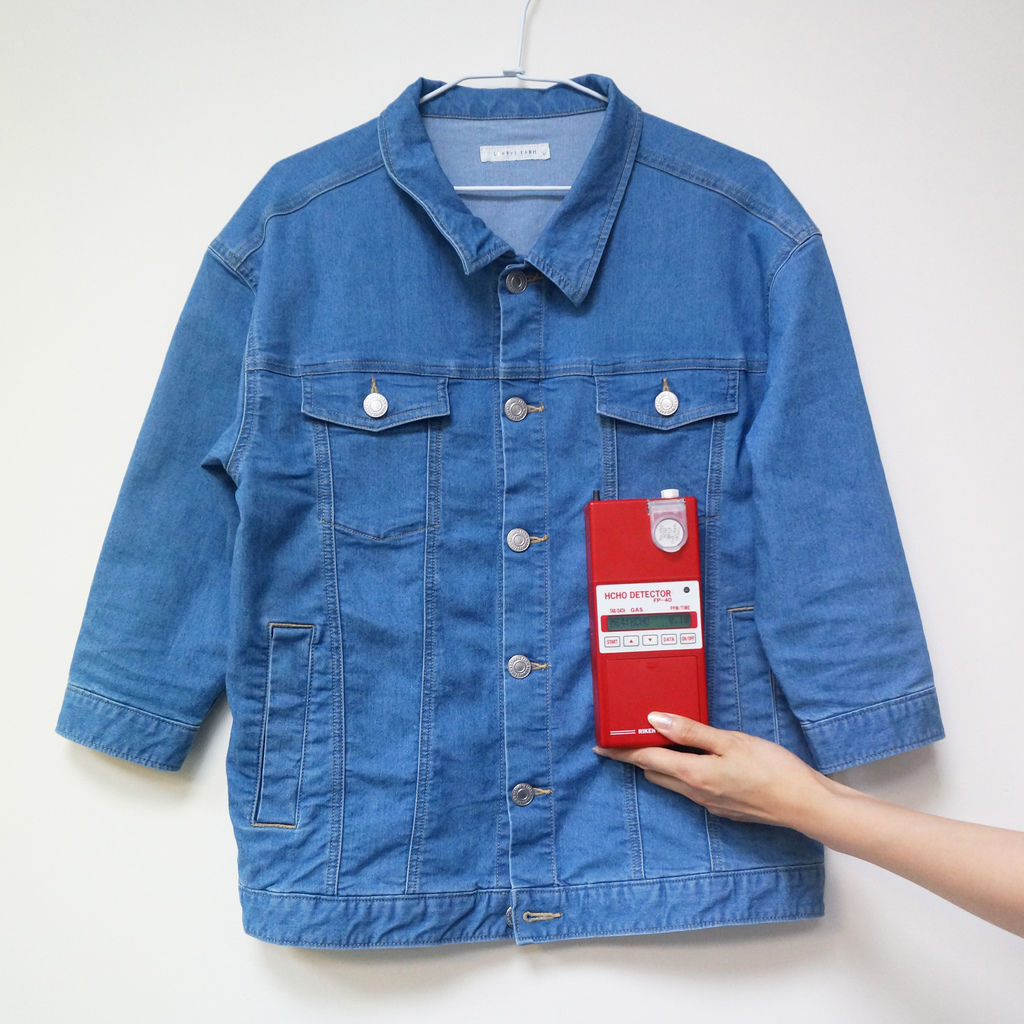 使用甲醛檢測器測量,測出專櫃牛仔衣逸散在空氣中的甲醛濃度高達 0.10ppm ,仍然是超標的...