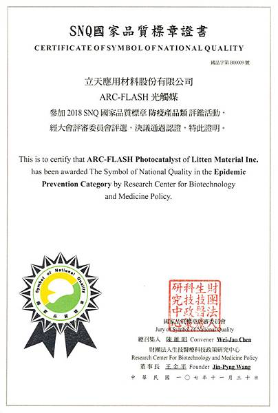 ▲ARC-FLASH光觸媒擁有多項國際認證及合格檢驗報告。