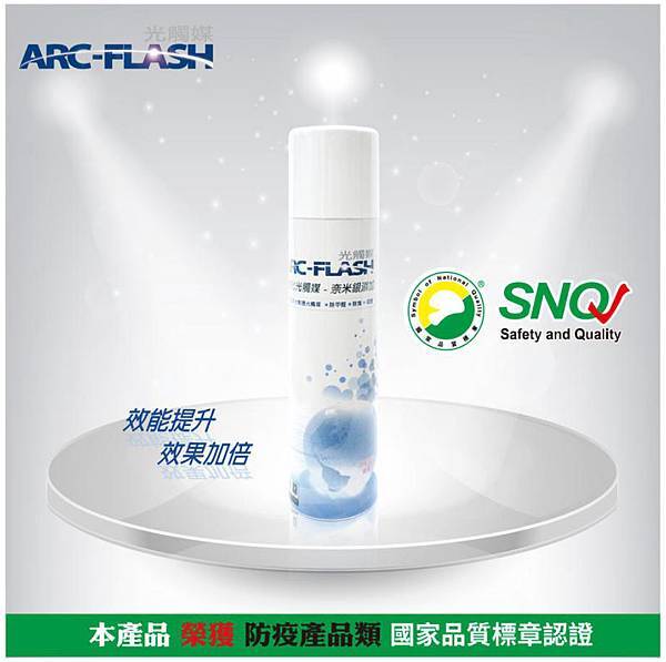 另一款碳敏化光觸媒10%額外添加了奈米銀成份,能在較弱光的環境下保有光觸媒效果;無光環境下也能達到殺菌功能。此項產品還擁有SNQ防疫產品類國家品質標章認證,是目前ARC-FLASH光觸媒所研發的民生用品中效能最為極致的。